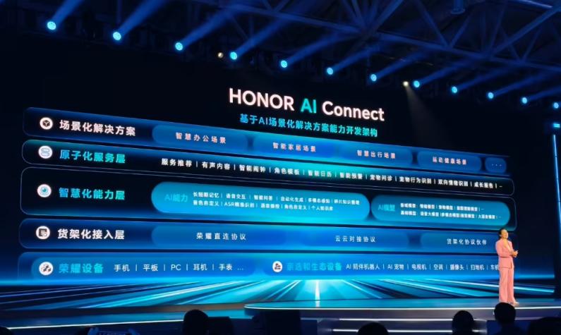 其推出的“1×3×N”生态战略成为这一转型的顶层设计:“1”代表HONOR AI Connect平台,作为底层中枢,开放荣耀自研的AI能力,实现跨品牌、跨设备、跨场景的智能互联;“3”指生态赋能、渠道赋能与技术品牌三位一体的输出模式,助力合作伙伴接入荣耀AI体系;“N”则覆盖教育办公、智慧家居、健康穿戴、车载互联等多个产业场景,意图构建一个以用户为中心的全场景智慧生活闭环。