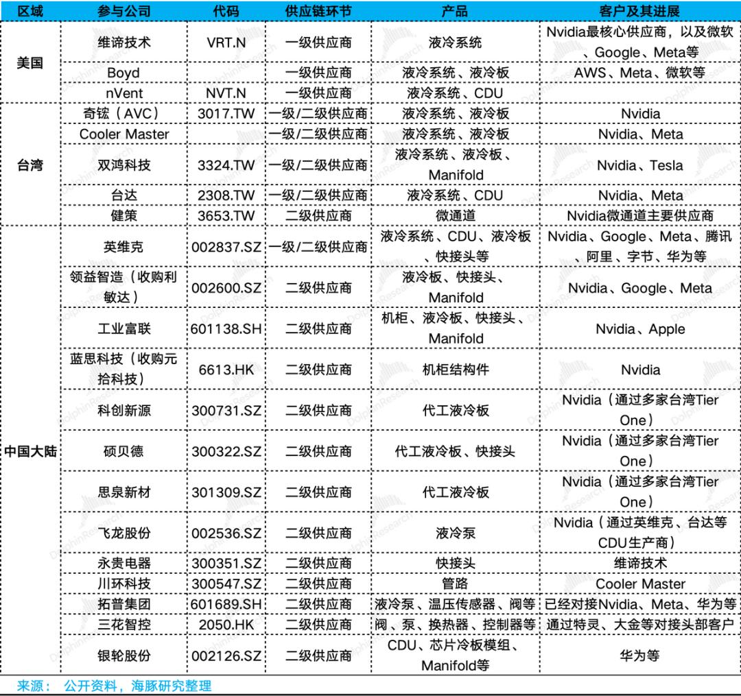 所以,中国大陆厂商能做的事情很有限,绝大部分都只能供应基础零部件或者做做代工。例如在液冷领域,系统级液冷模块的核心供应商就是美国的维谛技术。