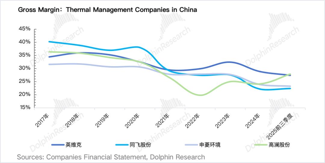 这里展示国内几家头部温控企业的盈利水平变化,虽然它们的产品不止限于储能领域,但可以看到,行业毛利率的确整体呈下降趋势,这显示出行业的竞争激烈。不过,2025年,基于行业下游需求的改善,部分企业盈利水平有所回升。