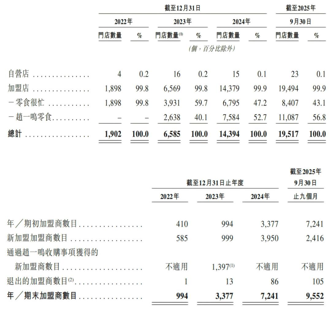 以鸣鸣很忙集团为例,截至2025年9月30日,其19517家门店中,由加盟商开设及经营的门店占比超99%,加盟商数量达9552家,单个加盟商平均开店数量增至2.04家。