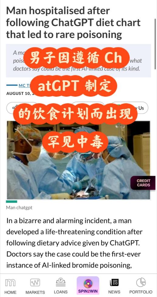 2025年,一则关于“溴中毒”的报道引发广泛关注:一位60岁的海外用户出于对健康的执念,决定从饮食中彻底“清除氯”。在与ChatGPT多次对话后,他竟采纳其建议,长期用含溴化合物替代食用盐,导致体内溴含量达到了惊人的1700mg/L,超过正常人含量的两百倍。