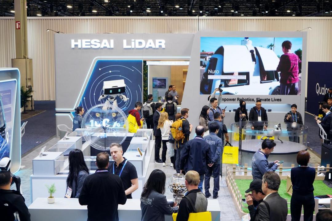 禾赛今年的 CES 展位,仿佛一个“小型机器人社区”:Vbot 智能伴随机器狗在与人群互动,追觅割草机器人展示自如穿梭。这些机器人都采用了禾赛JT系列3D激光雷达,现场实时展示自主移动与避障能力。