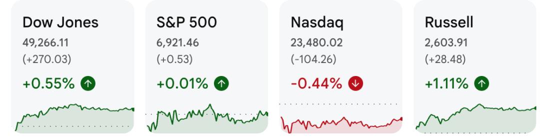 相比之下,代表小盘股的罗素2000指数大幅上涨1.1%,刷新了历史新高,并且在年初的五个交易日内,领先纳指100指数约4个百分点,创下历史上第二强的开年表现。