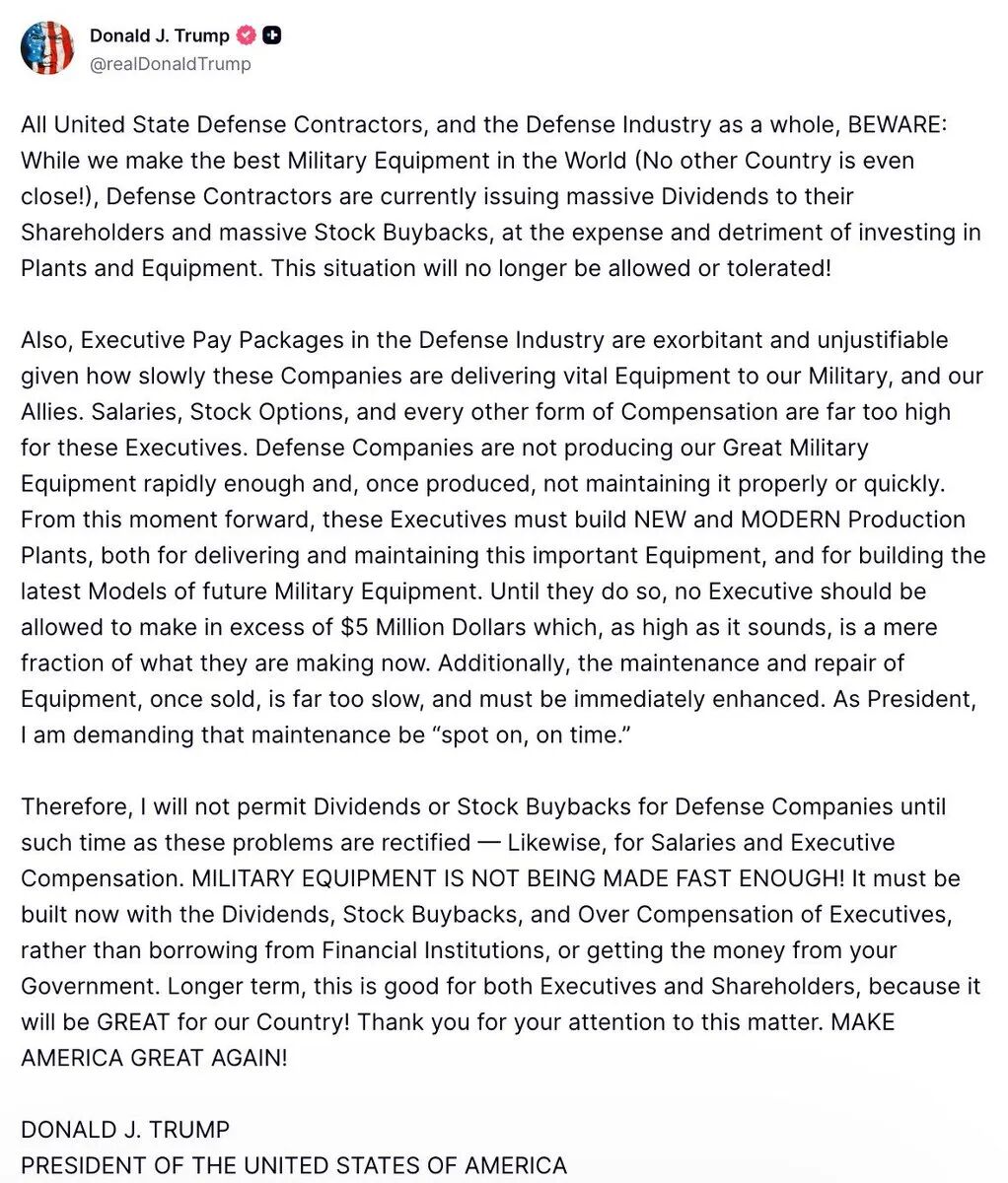 特朗普明确表示,未来几年的军费缺口将通过关税收入填补。对于投资者而言,这预示着订单体量将迎来史无前例的爆发。然而,这笔钱并不好拿。特朗普对军工企业提出了三大限制: