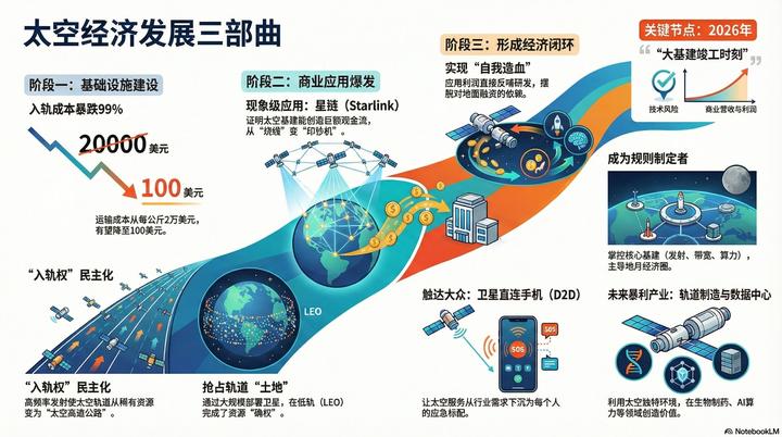 如果说 2020 年是太空赛道的“实验室阶段”,2026 年就是它的“大基建竣工时刻”。 SpaceX 完成了从“造火箭”到“定规则”的跨越。ASTS/RKLB/RDW 正在应用层抢占高地。投资者关注的不再是火箭是否会爆炸,而是这台巨大的“轨道提款机”每年实打实的营收和利润。