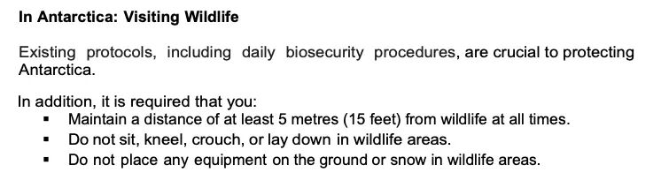 日常生物安全程序对于保护南极洲至关重要。您需要:始终与野生动物保持至少 5 米(15 英尺)的距离。不要在野生动物区坐着、跪着、蹲下或躺下。