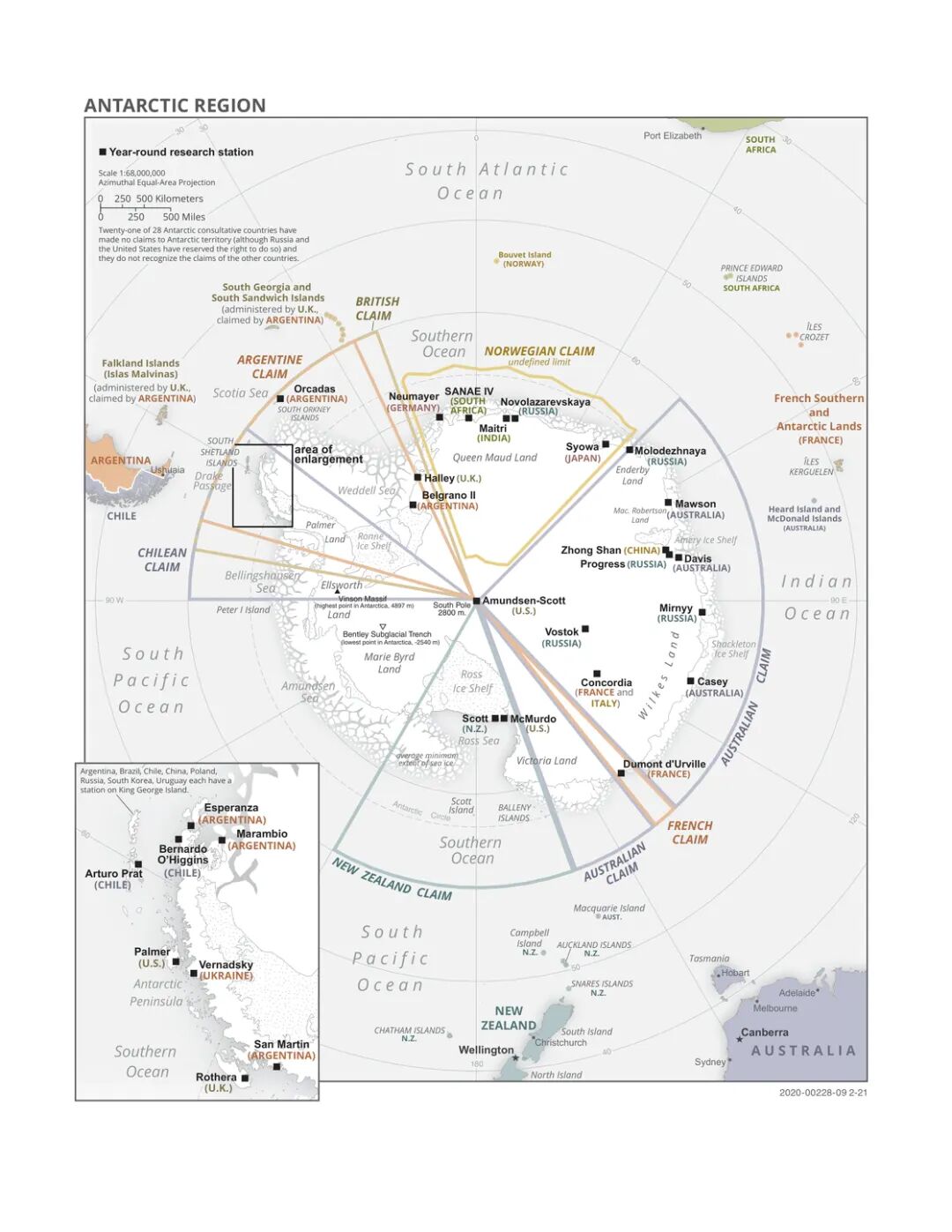南极洲科学考察站及领土主张地图 (2015)