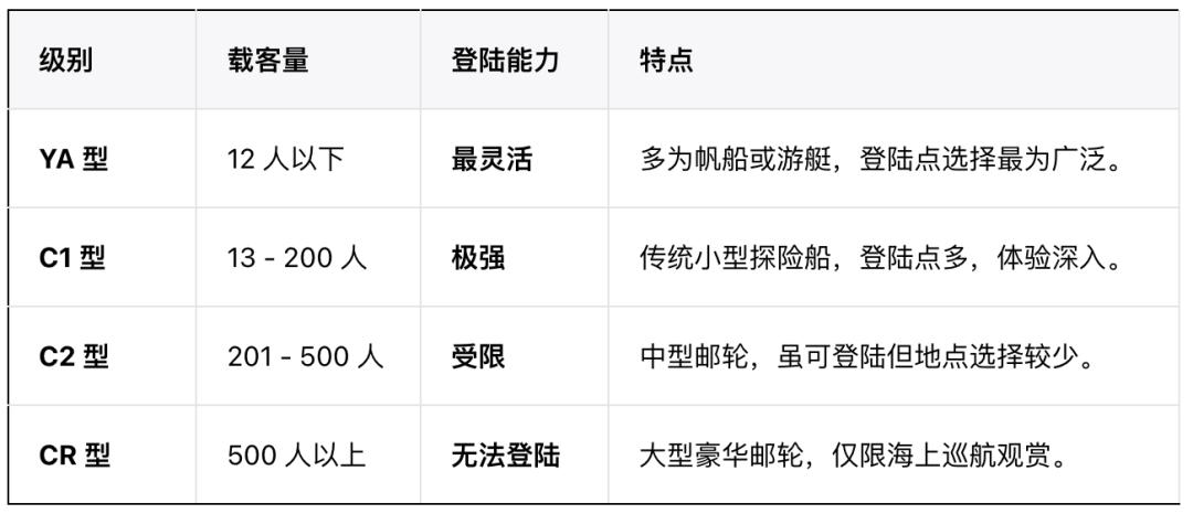 在南极旅游中,船只的载客量是一个非常关键的因素,因为它直接影响了游客的旅行体验。IAATO 将运营南极旅游线路的游轮分为四种级别,分别是: