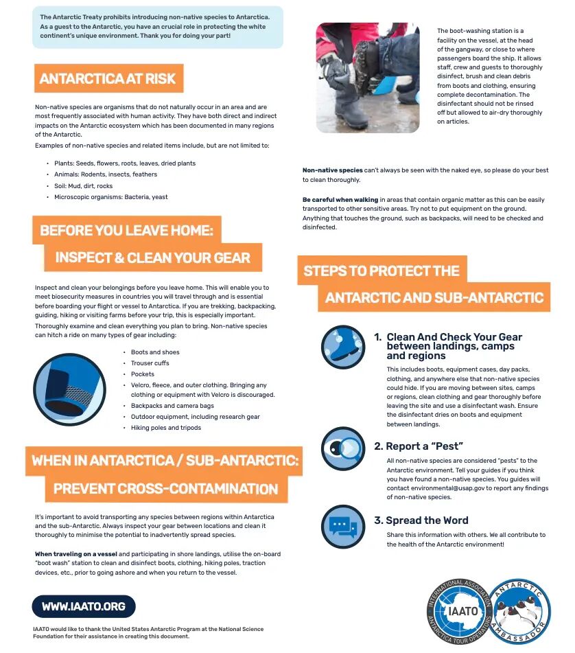 在游客乘坐的游船靠近南极之前,必须首先听取导游讲解注意事项,然后聚集到船上的衣帽间,接受生物安全处理,衣物、随身用品要吸尘,鞋子要消毒,确保不把外来物种带上南极。不过,非本地物种确实曾因失误被带上南极,但是就目前所知,那并不是游客造成的。有研究表明,科研项目比旅游业带来的环境冲击要更加严重。