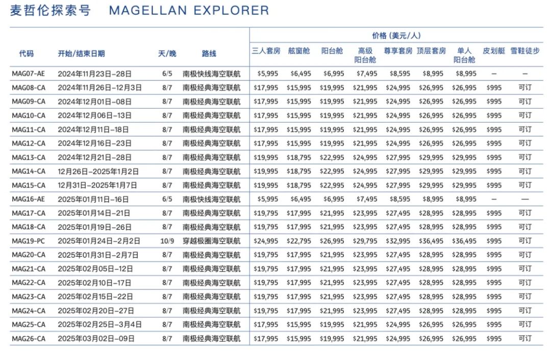 Antarctica21 旗下麦哲伦探索号去年的价格表,可以参考一下
