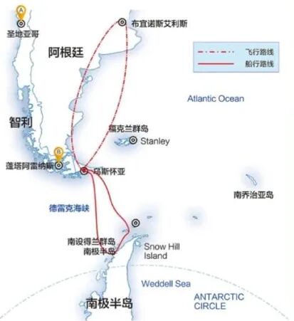我把路程分为三段:第一段是国内飞到阿根廷或者智利,第二段是从国外城市到达去南极的港口城市。第三段就是从主权国家到南极。去南极旅程主要还是以坐船走海路为主。