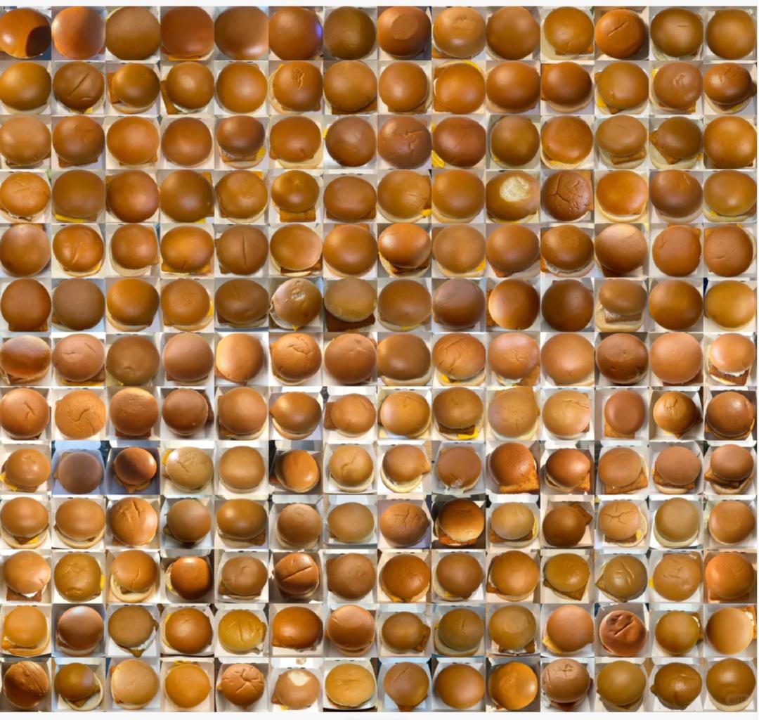张俊说,他最初开始拍摄光滑发汉堡,是想通过无厘头的艺术形式和汉堡照片“批判当下标准化社会和社交算法流量机制的无意义,并记录一下留学期间的窘迫生活”。