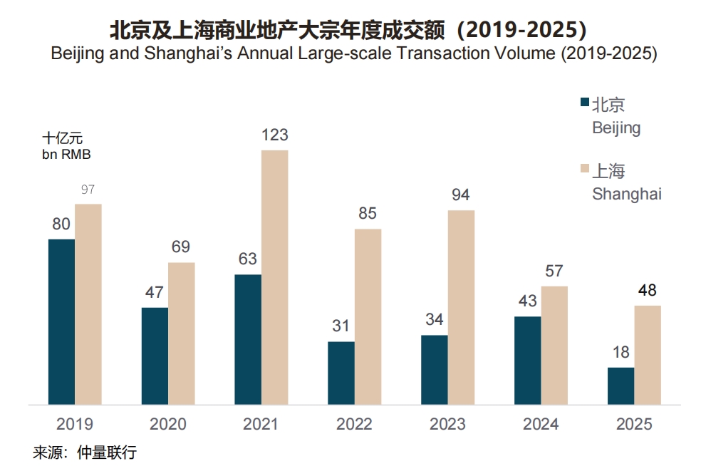 与租赁市场的调整态势相呼应,2025年北京商业地产投资市场同样呈现放缓节奏。仲量联行数据显示,全年大宗成交总额录得约180亿元,较2024年下降58%,较过去五年均值大致减半,第四季度市场活跃度进一步走弱。从资产类别来看,商业零售资产成为资本关注的焦点,展现出相对较强的抗周期属性。