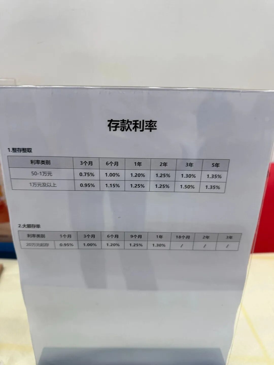 时代财经1月8日走访广州某农商行发现,该行推出的1个月大额存单,利率为0.95%,且目前该行大额存单的最长期限为1年,利率为1.30%(20万起存),18个月、2年、3年均无产品在售。