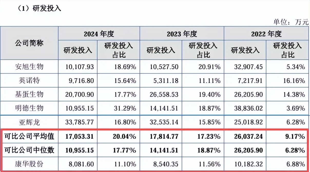 招股书数据显示,2022年至2024年康华股份的研发占比分别为6.88%、11.56%、11.10%,可比公司平均值分别为9.17%、17.23%、17.77%。