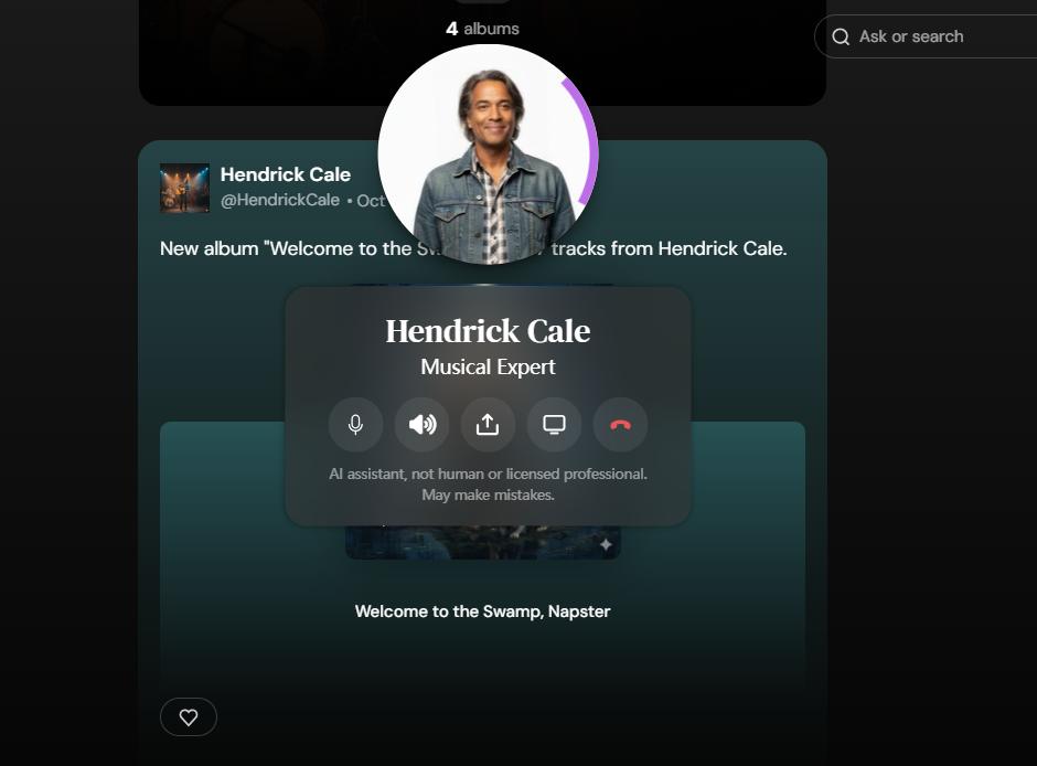 在首页最显眼的位置,Napster展示的是多组风格化的虚拟AI艺人,用户根据喜欢的音乐风格(如另类、布鲁斯、乡村、Hip-Hop、摇滚等)可以关注虚拟艺术家动态、与其进行语音对话,甚至直接与其展开文本+语音对话式音乐创作。