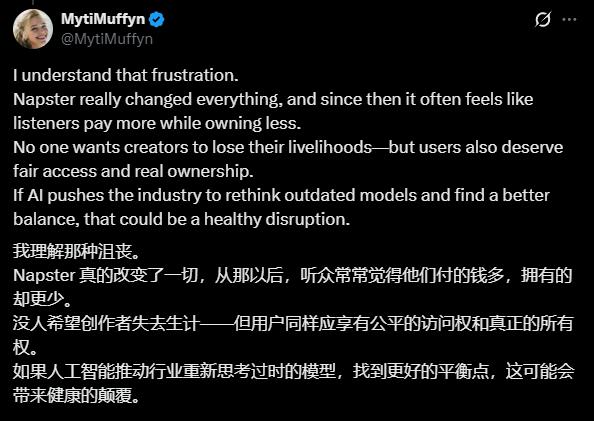 在消息公布后,不少业内人士也保持乐观态度,纷纷表示完全支持行业向AI迈进。他们认为,AI技术可能会促使行业重新审视那些过时的模式,从而找到一种更好的平衡,既能保护创作者的利益,也能让用户享有更公平的音乐体验。