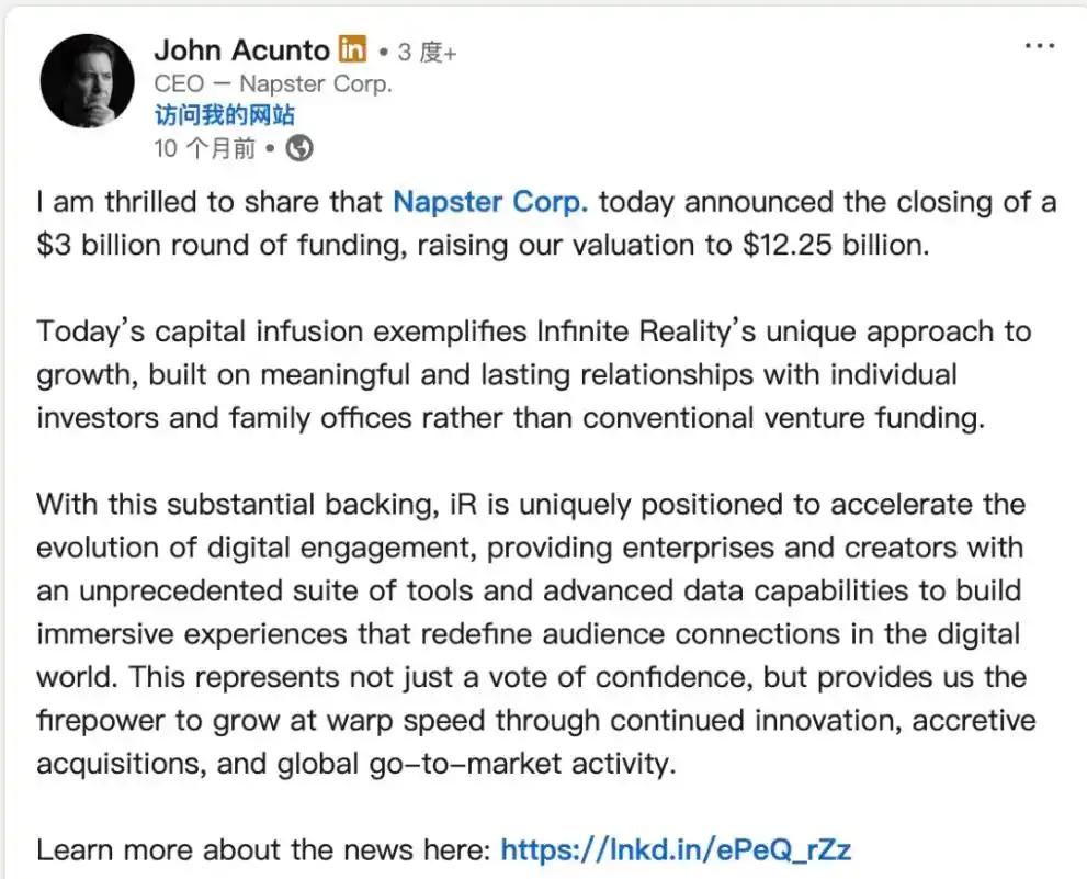 去年1月,Infinite Reality CEO John Acunto还向员工和投资者宣布,一位神秘投资方已承诺以120亿美元的估值向Napster注入约33.6亿美元资金。