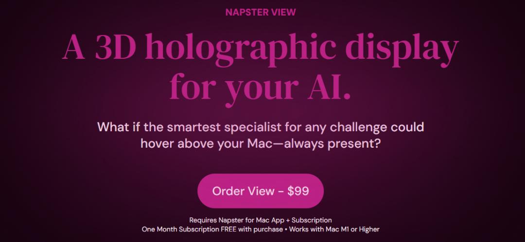 与上文的音乐服务类似,Napster View也是主打AI沉浸式数字角色的视觉交互、以及AI数字分身功能,借助MacBook摄像头“注视”用户。用户既可以在Mac设备上下载应用使用,以每月20美元的订阅方式接入完整服务;也可以选择购买定价99美元的硬件终端。