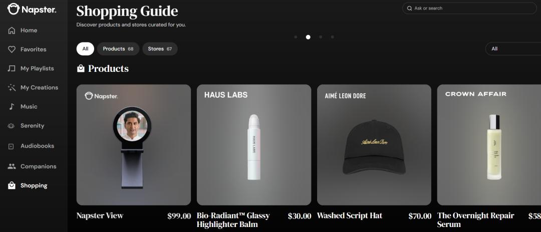 产品形态上,Napster已完成一次相当彻底的重构,彻底放弃了传统人类曲库,而是转向以AI音乐创作聆听、有声书、虚拟陪伴、购物为核心的综合性数字内容平台。