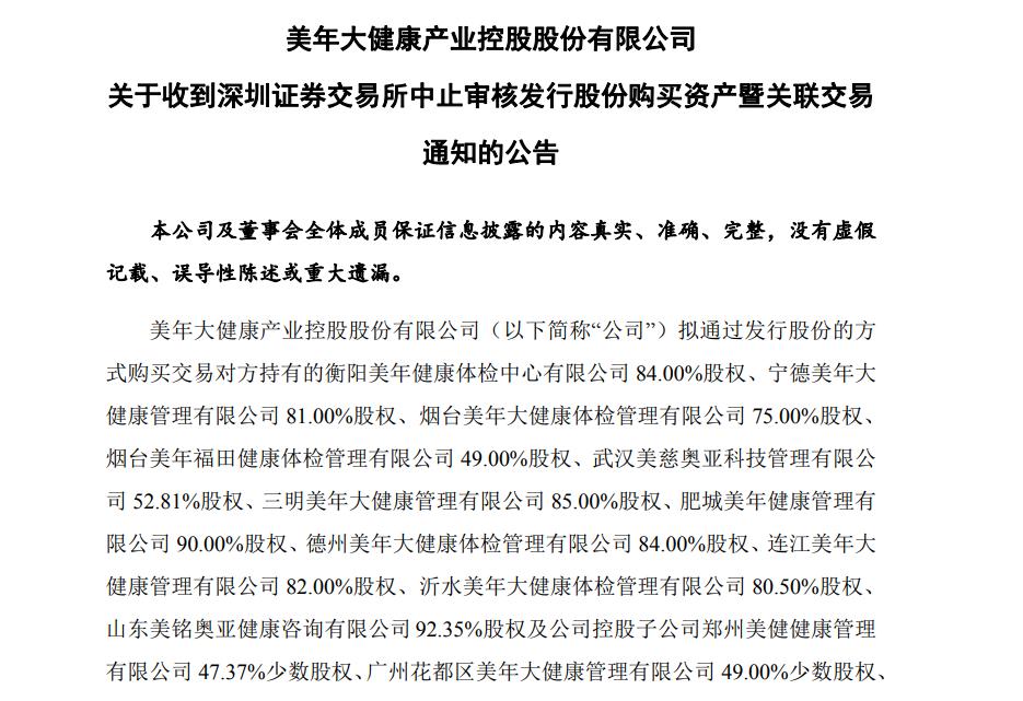 体检龙头上市公司美年健康,以发行股份方式并购资产计划被中止了。