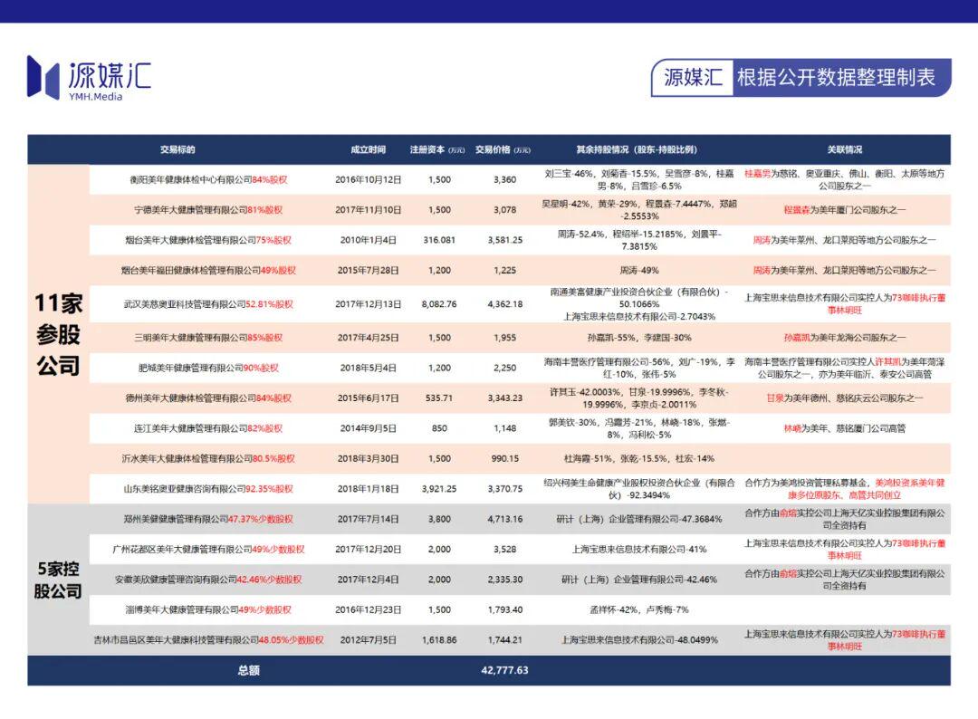 在美年健康最初发布的并购计划中,实际并购体检中心为19家,方案进入落地环节后,减少至16家,包括11家参股公司和5家控股公司,交易价格约4.28亿元。