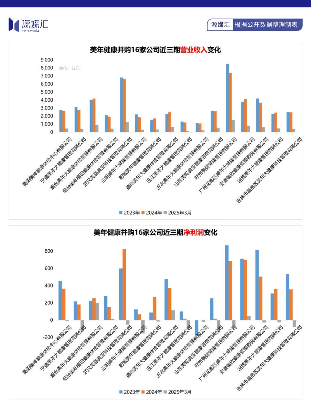 根据资产评估说明书,美年健康拟收购的16家体检中心中,有13家净利润整体呈现下滑趋势;同时,2025年一季度有10家公司净利润为亏损。