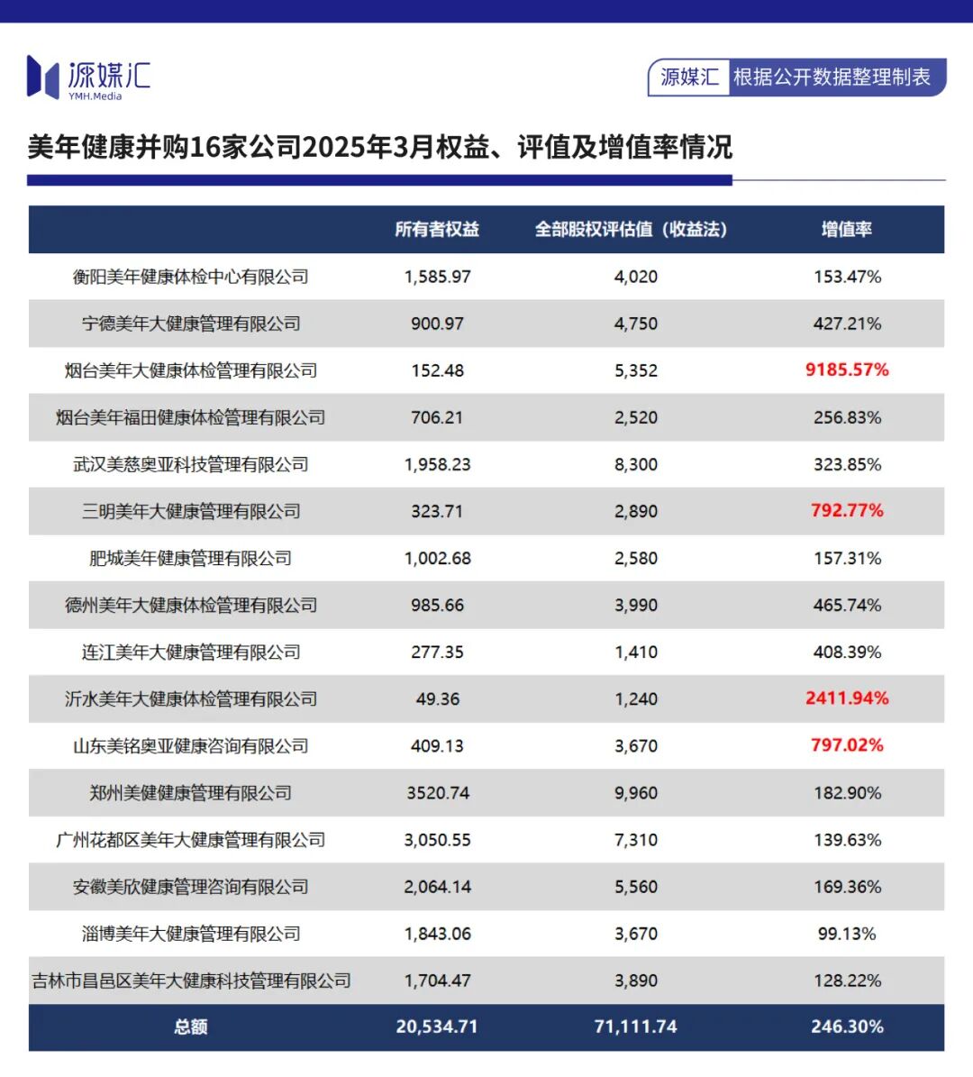 关键在于,美年健康给这16家体检中心很高的估值——合计所有者权益额约2.05亿元,而评估价值为7.11亿元,增值率达246.3%。其中,对烟台美年大健康体检管理有限公司(下称“烟台美年”)的资产评估值增值率达到了9185.6%。