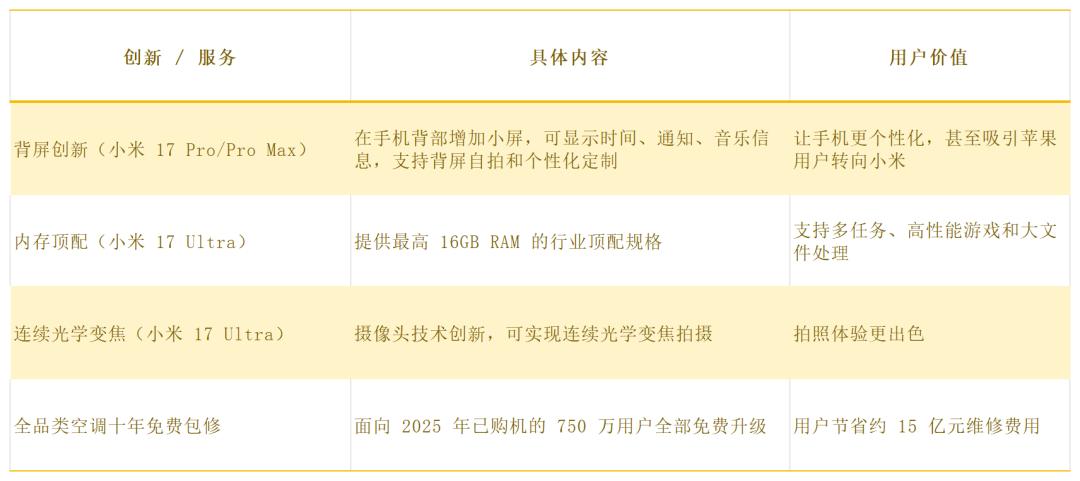 它的价值主线是:高端化——不是纯粹卖高价,而是卖高端体验:比如小米17 Pro的背屏创新,空调推出十年免费保修计划。