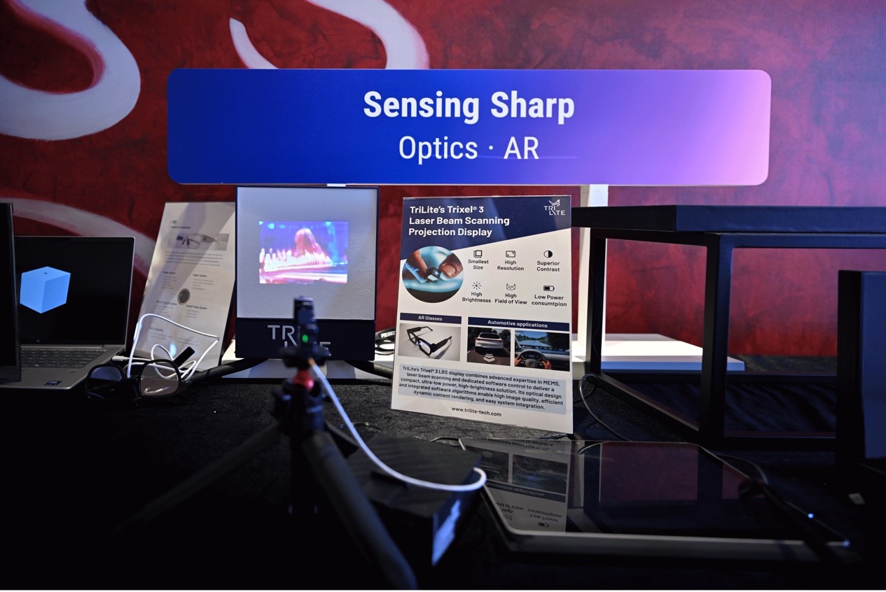 光学领域的布局进一步完善了瑞声科技的全栈能力。基于此前对业界领先的光波导技术公司Dispelix的战略收购,瑞声科技此次展出的高性能衍射光波导解决方案,实现了轻量化设计与广视场、高清晰度的完美平衡,为AR眼镜带来体验升级。配套的电致变色技术可根据环境光线智能调节镜片透光率,有效提升AR设备的户外可视性与佩戴舒适度。展台现场,沉浸式的观影眼镜Demo、直观演绎了从光学显示、智能声场到自适应交互的端到端解决方案,标志着瑞声科技已形成“感知+光学”的深度融合生态。