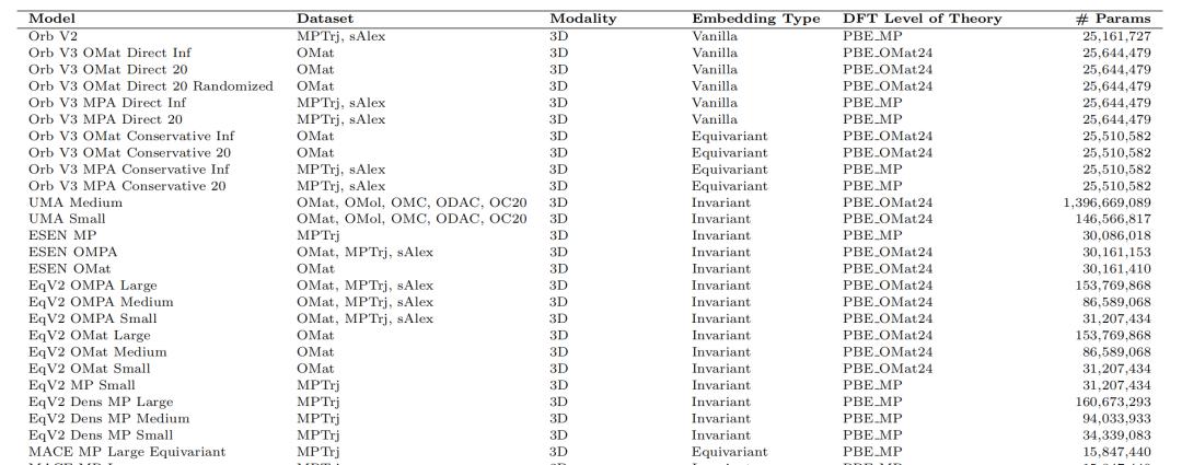 多元架构的对比(部分):论文评估了包括Orb、MACE、DeepSeek在内的近60种模型,为科学家的选择提供了定量依据。