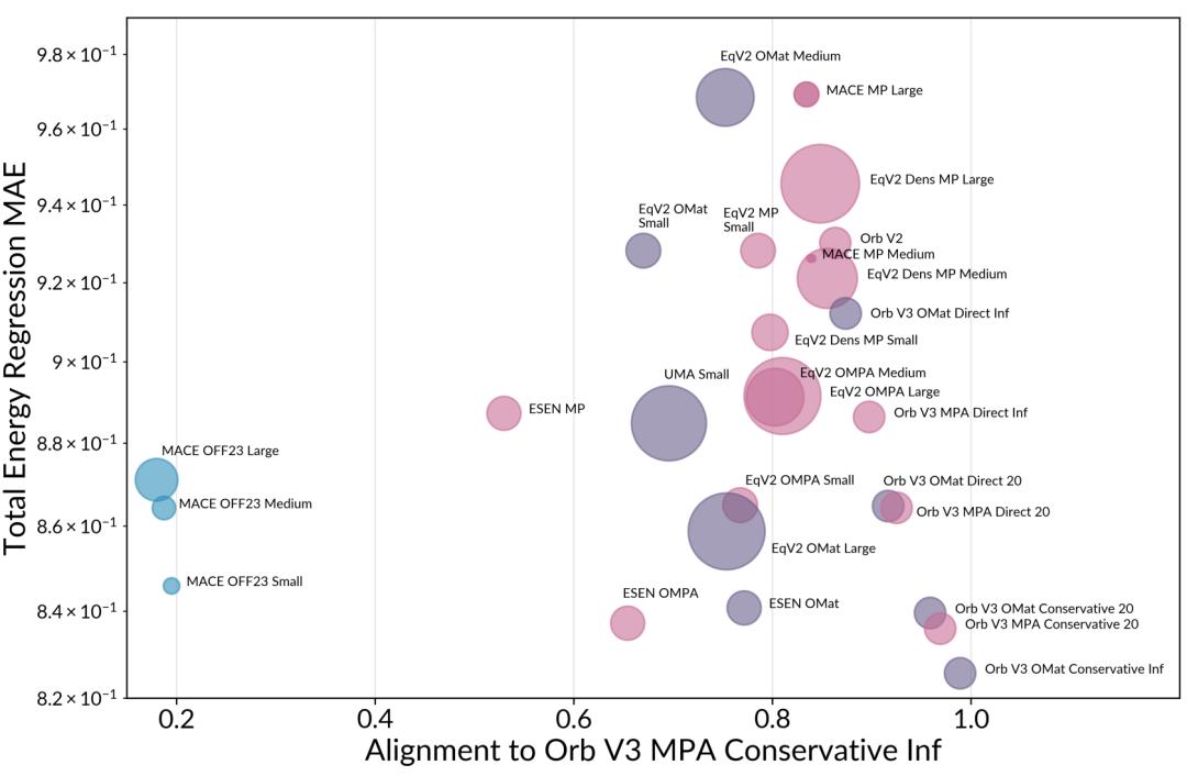 图中圆点的大小代表模型参数量。可以看到,即使是较小的模型,只要其表征能与最佳性能模型对齐,同样能在分子能量预测任务中获得极高的准确度。