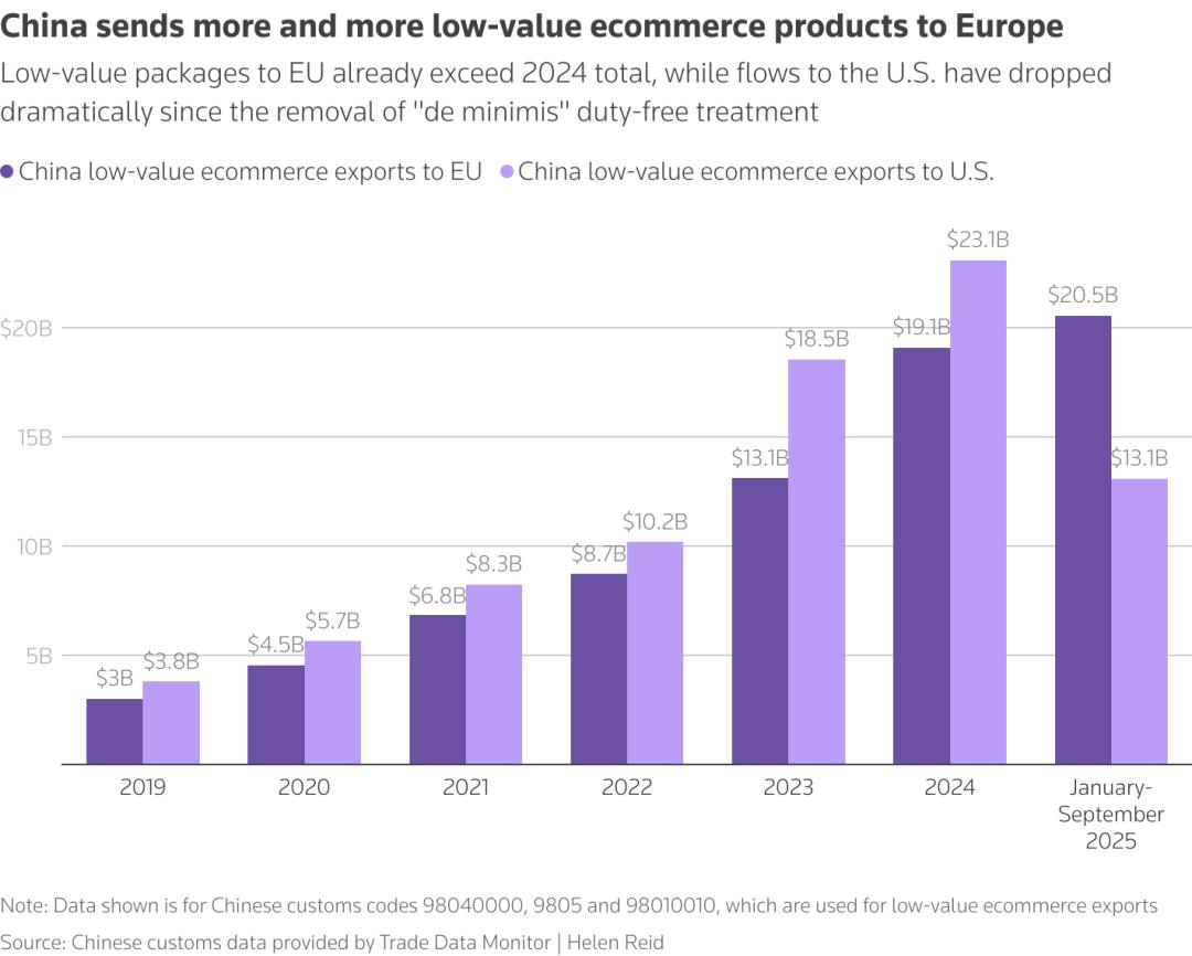 海关数据显示,2024 年,中国对欧盟低价电商出口额为191 亿美元,对美国出口额为231 亿美元;但今年2025 年 1–9 月,流向欧盟已经205 亿美元,已超去年全年,而对美国仅131 亿美元。