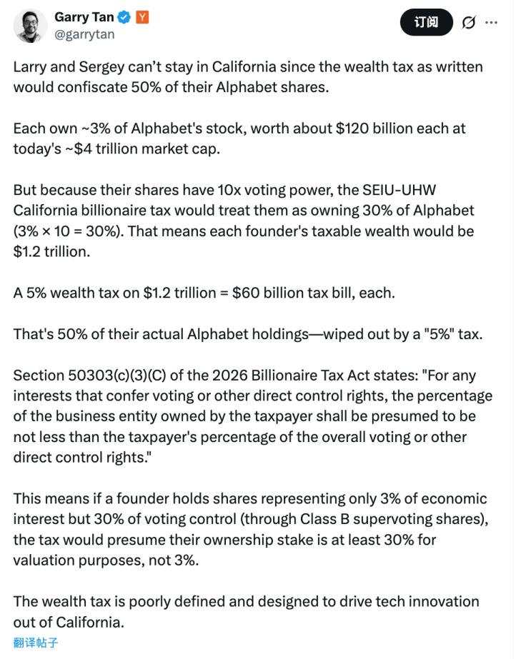 Tan认为,“新富人税”中的一些定义含糊,只会把科技创新驱逐出加州。