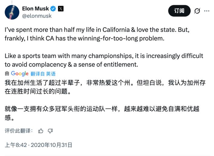 马斯克几年前就开始骂骂咧咧,指责加州过度税收、过度监管,并且陆续把掌管的几家公司迁出了加州,房子也都卖了,公司连人全都跑德州去了。