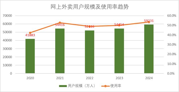 2024年末,我国网上外卖用户规模达5.92亿人,占网民总数的53.4%,渗透率持续提升并已覆盖过半网民。在接近6亿用户的规模下,若排除年龄层与消费习惯的影响,基本意味着外卖市场已趋近饱和。此时的市场竞争必将陷入存量博弈,而无法拉动市场整体增长。
