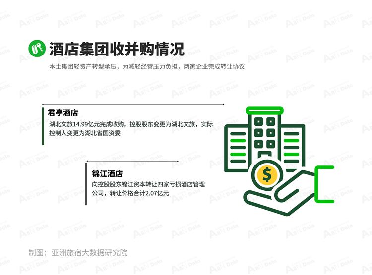 年末,本土酒店集团轻资产转型承压,为减轻经营压力负担,本月两家企业完成转让协议。其中君亭酒店将易主湖北文旅集团,湖北省国资委为实际控制人,锦江酒店则转让四家亏损酒店管理公司。