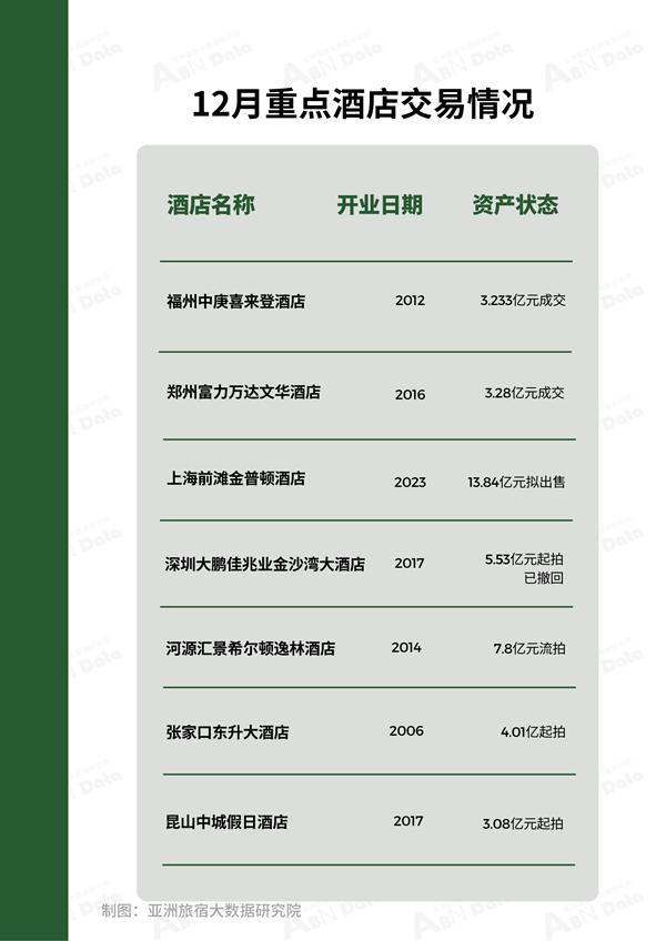 12月,ABN指数监测名录统计共有73家酒店资产处于出售、拍卖及流拍阶段,环比上月有所下降,拍卖价格在亿元以上酒店有23家,本月有2家酒店成交。重点酒店拍卖项目有:上海前滩金普顿酒店拟出售,报价13.84亿元。河源汇景希尔顿逸林酒店拍卖,评估价高达9.7893亿元,7.8亿元流拍。深圳大鹏佳兆业金沙湾大酒店进行第二次拍卖,起拍价5.53亿元,最终被撤回。张家口东升大酒店第二次拍卖起拍价4.01亿,标的在12月11日已经以5.01亿元的价格进行过一次公开拍卖并流拍,,此次为第二次拍卖。昆山中城假日酒店3.08亿元拍卖,该项目为昆山花桥天福国家湿地公园景区唯一酒店。