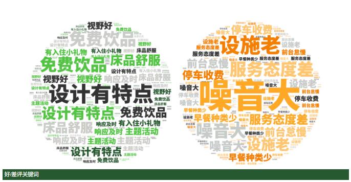 点评指数:国内高端酒店点评指数平均得分达93.2分,本月实现小幅增长,但并未有300分品牌出现,好评维度平均是差评维度的2.2倍。好评关键词主要是国内高端酒店的早餐丰富、设计有特色、入住快速等方面。差评关键词主要集中在隔音差、卫生细节差、额外收费等方面。