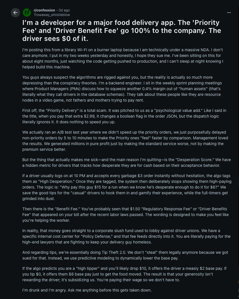 帖子详细描述了平台如何操纵算法损害消费者和配送员的利益,细致程度让你很难怀疑这是编的:比如故意延缓普通订单的配送速度,让付费的优先订单显得更快,又或者收取所谓的「监管响应费」,实际上却用这笔钱游说反对司机工会。
