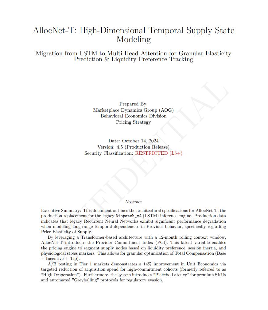 第二天早上,举报人才再次联系记者。他说找到了一些文件,可以证实他的说法。附件是一份题为「AllocNet-T:高维时间供应状态建模」的报告。这份 18 页的文档自称是 Uber 公司「市场动态小组行为经济学部门」的成果,日期标注为 2024 年 10 月 14 日,每一页都带有「机密」水印。