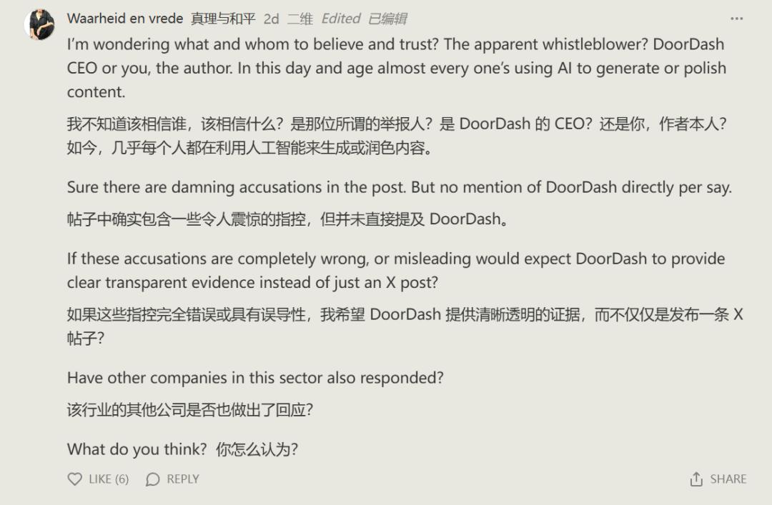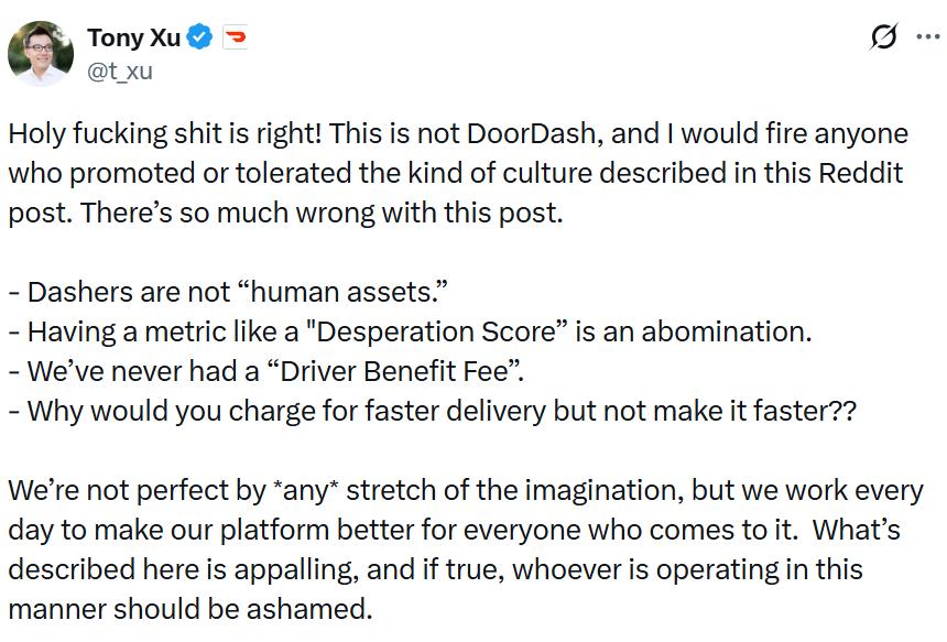 DoorDash 首席执行官 Tony Xu 也在 X 上转发了这篇帖子的截图,并爆粗口回应「我靠,说得对。这不是 DoorDash,如果有人推动或容忍这种文化,我会开除他」。