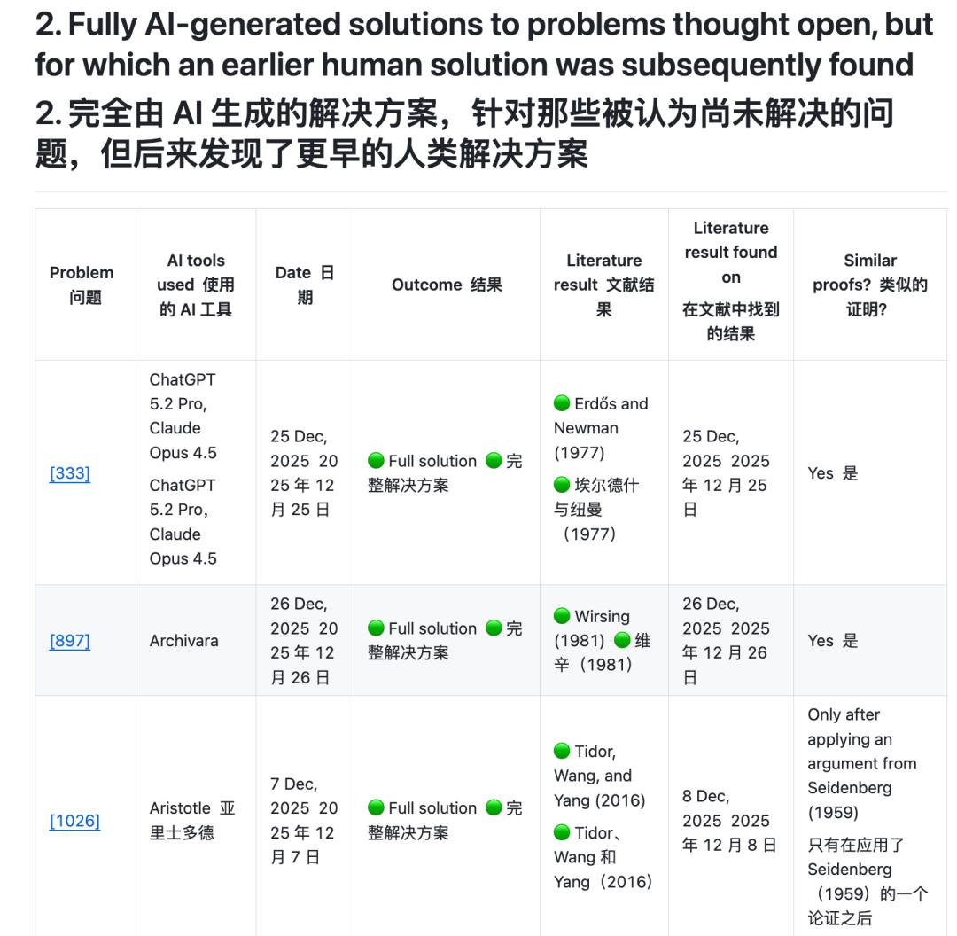 有AI生成了完整(或部分)解答,有AI以为题目未解、结果发现文献早就解过的案例,有AI参与文献检索,有AI把证明形式化到 Lean,有AI帮人类重写既有论证,等等。