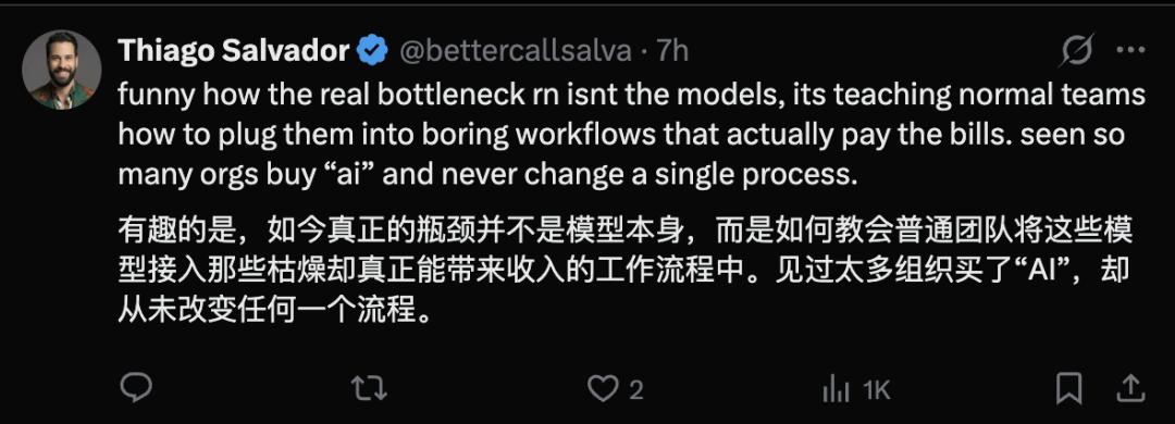 也有网友提到,真正的挑战在于如何将AI融入工作流程中:见过太多组织买了「AI」,却从未改变任何一个流程。