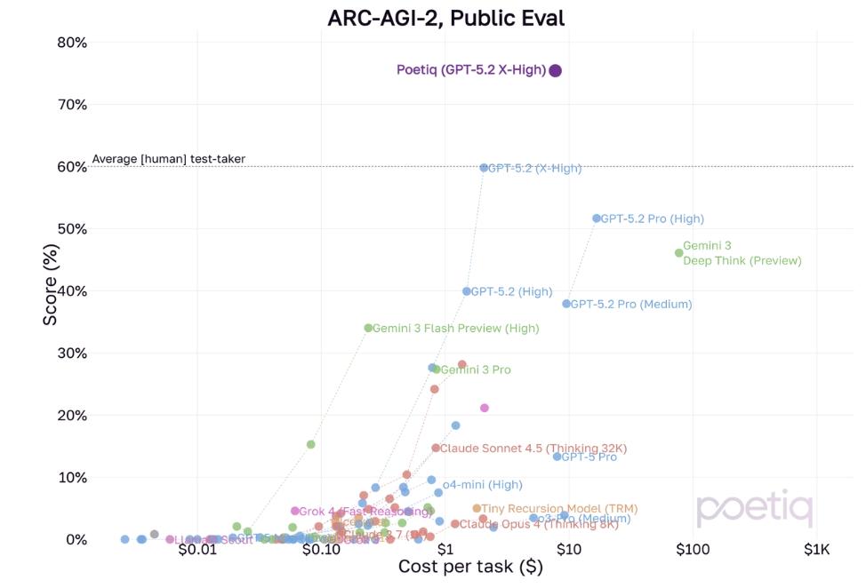 Poetiq(GPT-5.2X-High)在ARC-AGI-2数据集上实现了75%准确率,每问题成本不到8美元,超越前SOTA 15个百分点。