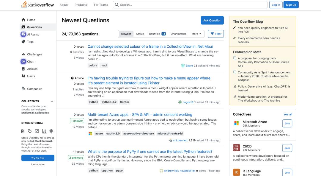 Stack Overflow缺乏吸引新用户加入的渠道,老用户逐渐转向大模型交互,平台上有关新技术的讨论也日渐稀少。