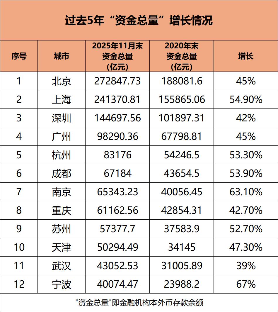 截至2025年11月末,上海本外币存款同比净增1.93万亿元,增量以断崖式优势排名第一,是过去一年全国最“吸金”的城市。