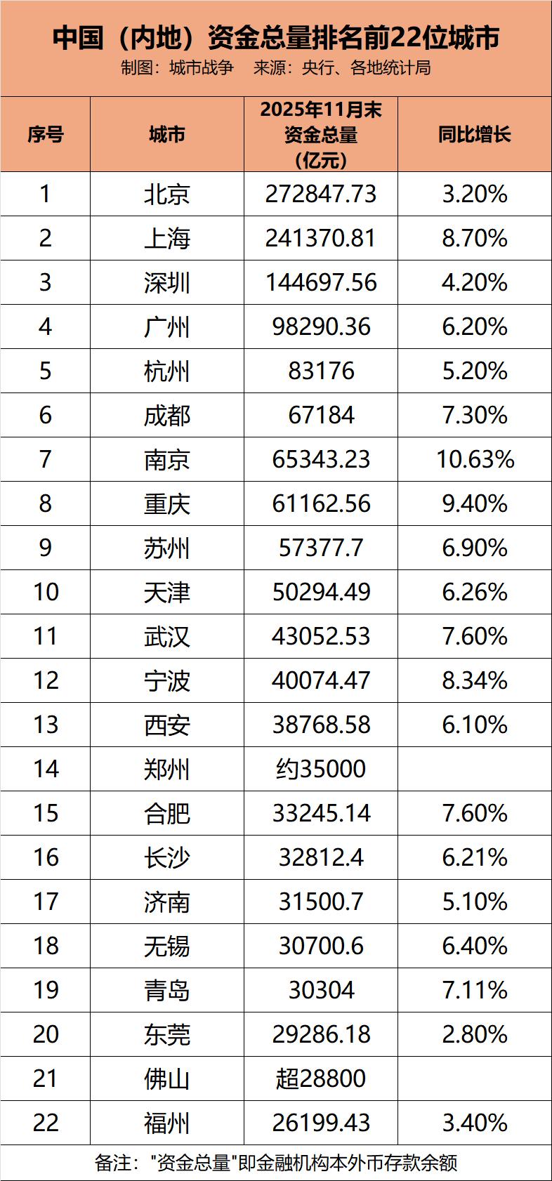 截至2025年11月末,内地各大城市资金总量排名如下: