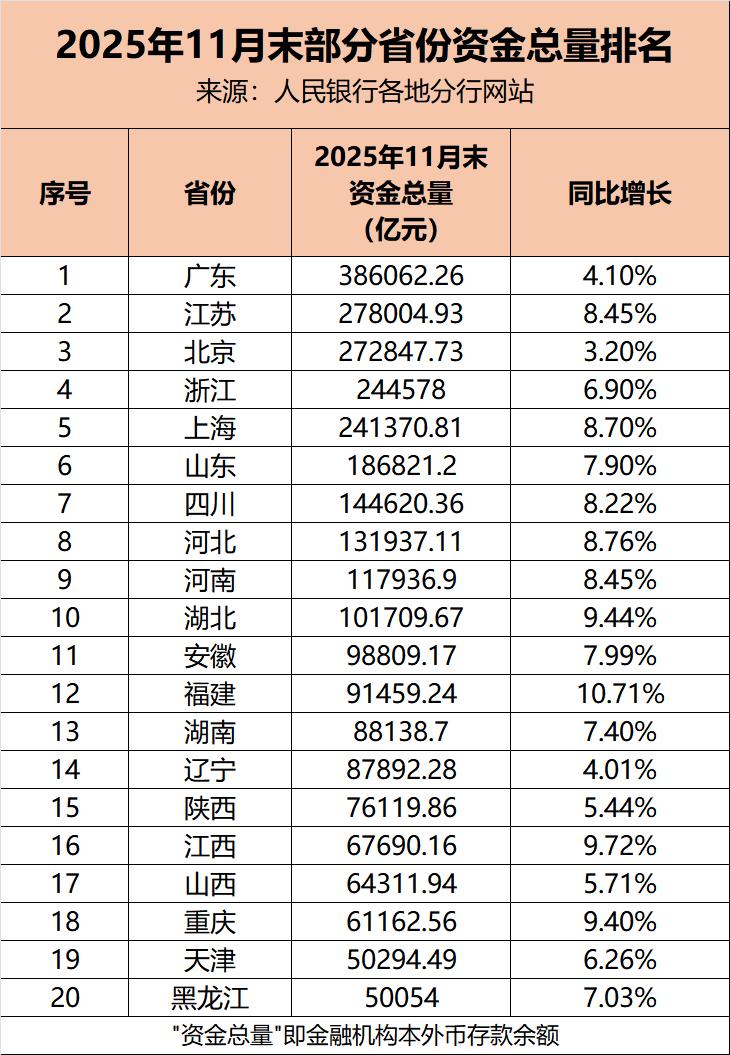 截至2025年11月末,广东的资金总量达到38.6万亿,高居全国第一,比第二名江苏多了10.8万亿,堪称一骑绝尘。