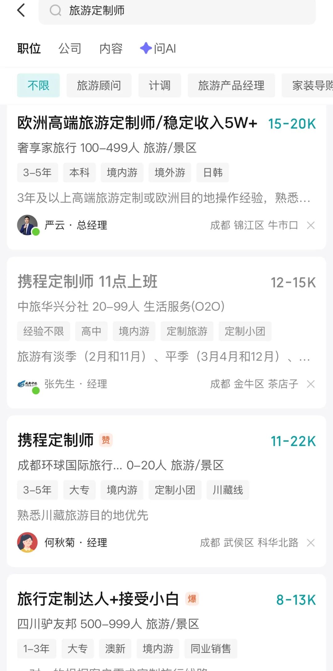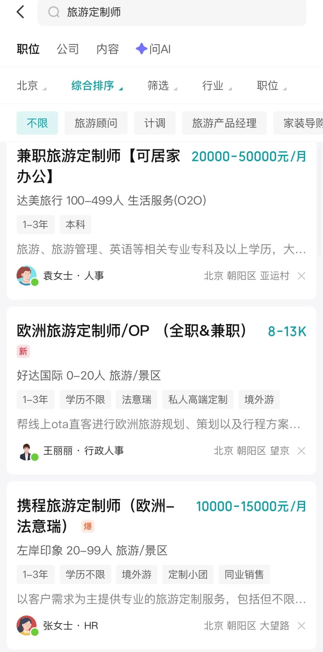 在各大招聘平台上,旅游/旅行定制师、旅行规划师、旅游顾问是永远在招人的岗位,城市分布十分广泛,上至北上广深、下至三、四线小城,都有旅游定制师的岗位。并且岗位需求量很大,仅携程一家就曾在2023年发布招聘计划,协同平台1500家供应商共招聘1万名旅游定制师。